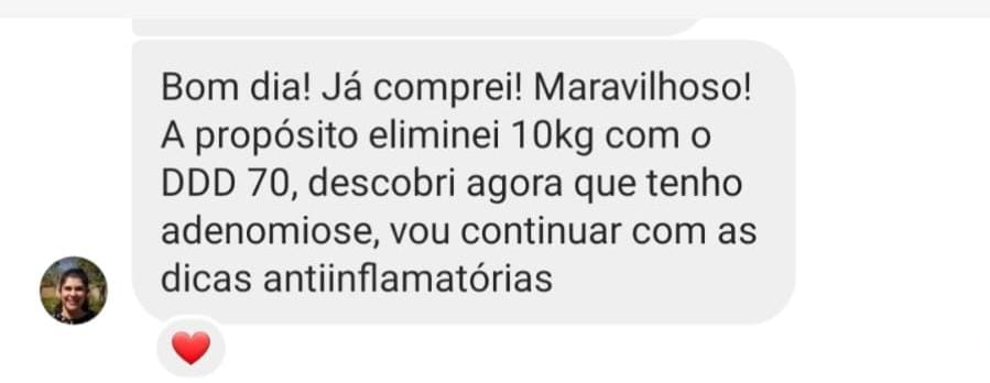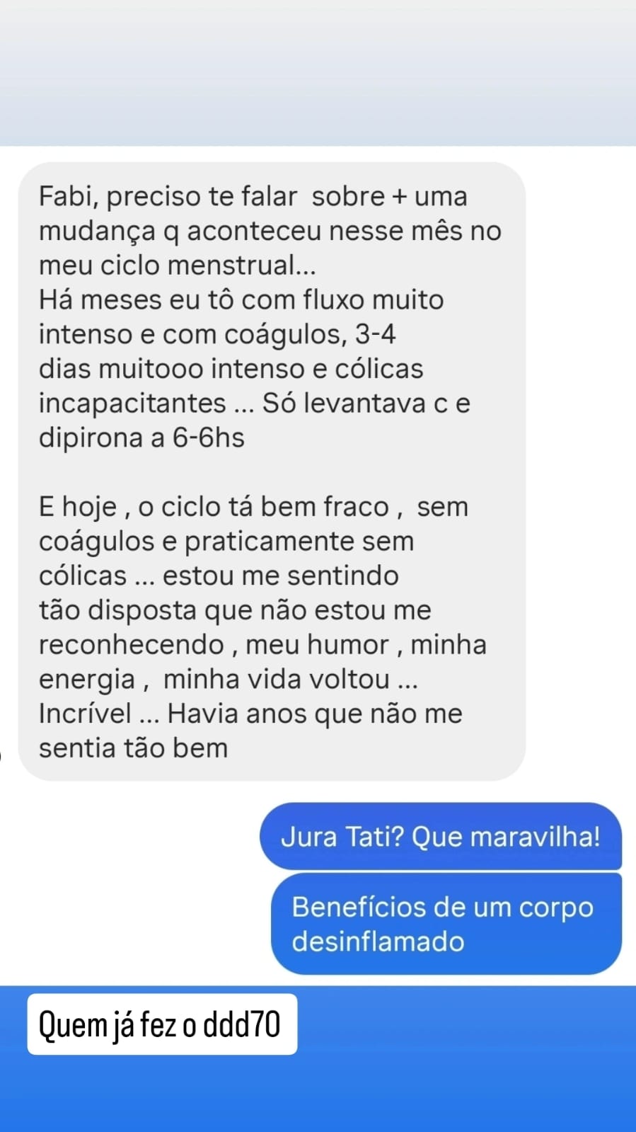 Você sofre de: ENDOMETRIOSE, ADENOMIOSE, INTESTINO IRRITADO, SOP, DIABETESTIPO 2 , LIPEDEMA, COLESTEROL ALTO, PRESSÃO ALTA, PROBLEMAS NA TIREOIDE, MENSTRUAÇÃO DOLOROSA E ABUNDANTE, MELASMA, ACNE, ROSÁCEA, ANEMIA QUE NAO MELHORA NEM COM REPOSIÇÃO, DORES NAS JUNTAS, EXCESSO DE PESO, GORDURA NO FIGADO, todo tipo de doenças de origem inflamatória indico que faça o DDD70.