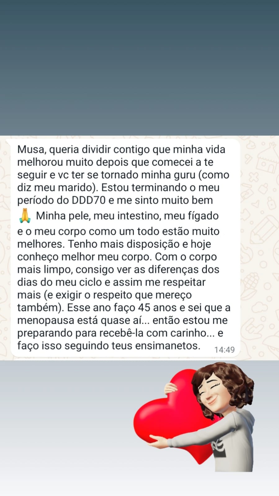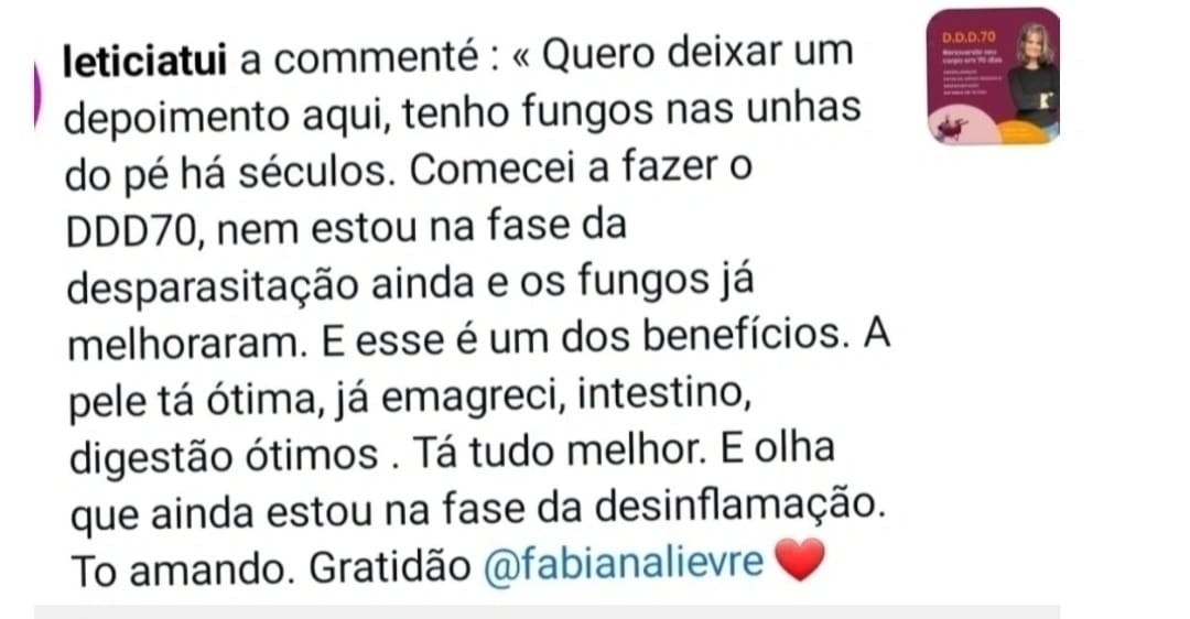 Desintoxicar o corpo vai ajudar a diminuir a inflamação e os resultados dos tratamentos serão melhores e duradouros. Se quer emagrecer e não engordar mais faça o DDD70, além de desintoxicar, mudar a microbiota e desinflamar, você vai reaprender a comer, entendo o que te faz bem ou mal e sabendo como se cuidar da melhor forma.